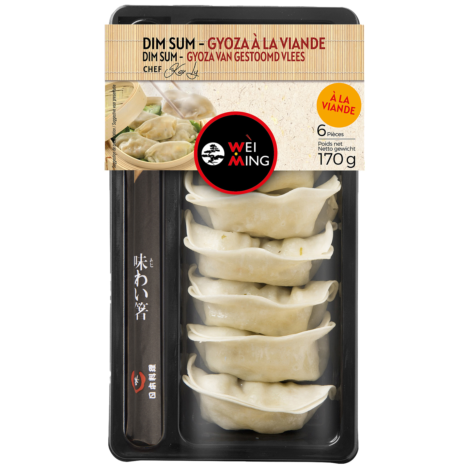 Ingrédients : Ingrédients : GYOZAS (154g): Farce (55%): chou, viande de porc (37%), poireau, protéine de soja, fécule de pomme de terre, huiles (huile de graines de sésame et huile de soja), acidulants (lactate de potassium et acétates de sodium), arôme naturel, sel, sucre, poivre noir en poudre, gingembre, sauce soja (eau, soja, farine de blé, sel, conservateurs (sorbate de potassium), colorant (caramel naturel)). Pâte (45%): farine de blé, eau, gluten de blé, sel.