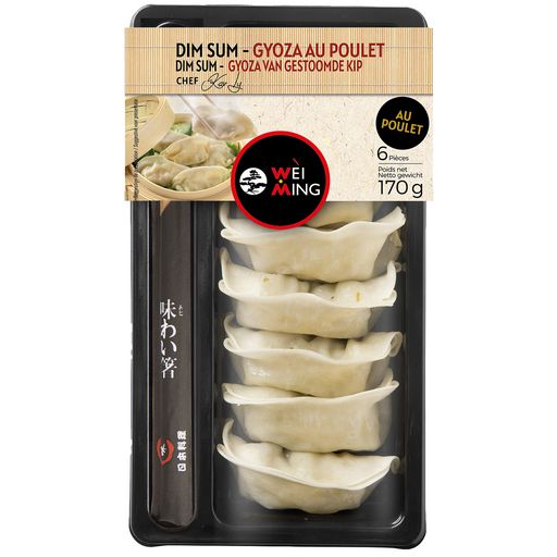 Ingrédients : Gyozas (154g): Farce (55%): chou, poulet (38%), poireau, protéine de soja, fécule de pomme de terre, huiles (huile de soja et huile de sésame), acidulants (lactate de potassium et acétates de sodium), arôme naturel, sel, sucre, sauce soja (eau, soja, farine de blé, sel, conservateurs (sorbate de potassium), colorant (caramel naturel)), poivre noir moulu et gingembre,. Pâte (45%): farine de blé, eau, gluten de blé, sel.