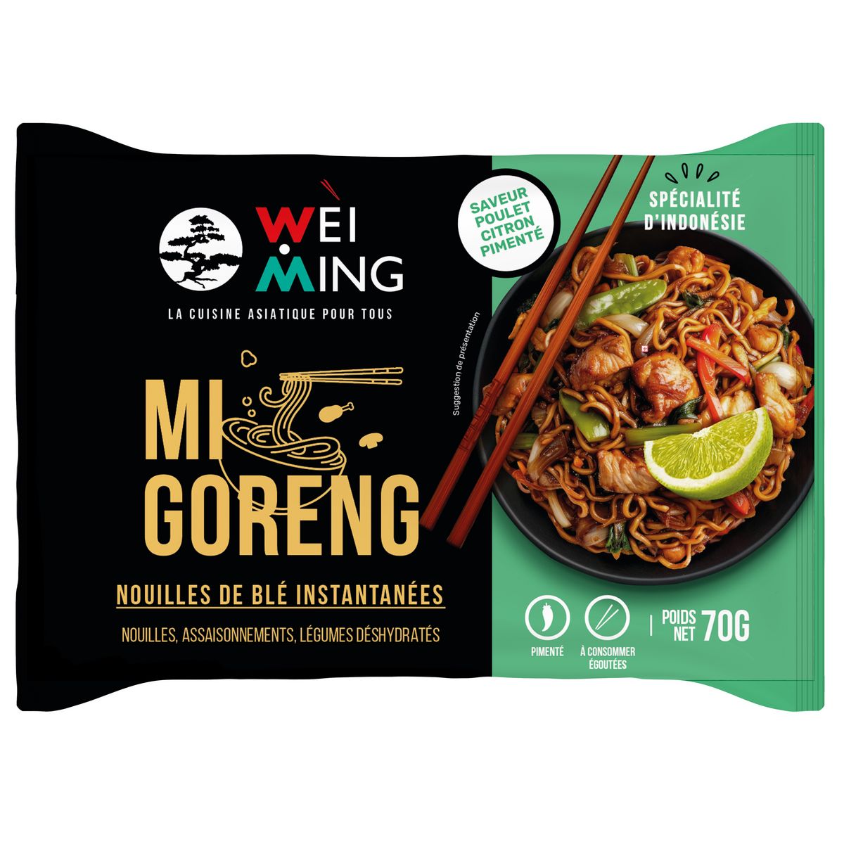 Les nouilles Mi Goreng au poulet Wei Ming, c'est un vrai voyage en Indonésie dans votre assiette ! Elles marient à merveille l'authenticité et le gourmand, pour un résultat qui réchauffe le cœur et les papilles. En quelques minutes seulement, vous obtenez un repas express, plein de caractère et d'authenticité, parfait pour une pause savoureuse à n'importe quel moment de la journée.