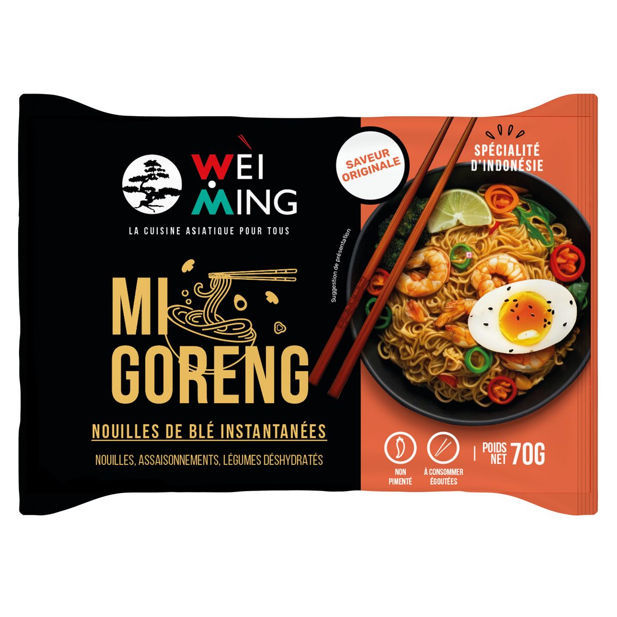 Les nouilles Mi Goreng Wei Ming, c'est un vrai voyage en Indonésie dans votre assiette ! Elles marient à merveille l'authenticité et le gourmand, pour un résultat qui réchauffe le cœur et les papilles. En quelques minutes seulement, vous obtenez un repas express, plein de caractère et d'authenticité, parfait pour une pause savoureuse à n'importe quel moment de la journée.