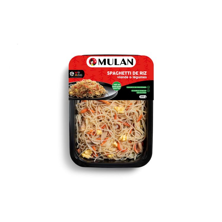Ingrédients : Légumes en proportions variables (42) % (chou, carotte, oignon), nouilles de riz (32 %), huile de tournesol, viande de porc (7 %), ŒUFS (3 %), sauce SOJA (eau, SOJA, sel, BLÉ, farine de BLÉ, extrait de levure, sirop de fructose-glucose, exhausteurs de goût : E621, E631, E635 ; colorant : caramel ordinaire ; édulcorant : E955), sel, exhausteur de goût : E621, boisson alcoolisée à base de riz (eau, riz, BLÉ, alcool, colorant : caramel ordinaire), sucre, poivre.