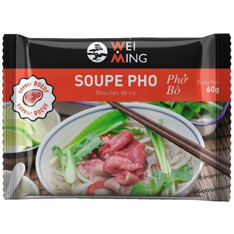 Ingrédients : Ingrédients : Nouilles de riz (riz, stabilisants E412 et E1404, sucre, sel / Sachet de soupe en poudre (sel, sucre, piment, extrait de levure, oignon, réglisse, sauce SOJA, exhausteurs de goût E631 et E627, arôme, acidifiant E330, anti-coagulant E551 nan, colorant artificiel E150d) / Sachet d'huile (HUILE DE SOJA, extrait d'oignon, extrait de gingembre, extrait de piment, arôme, colorant naturel E160c) / Sachet de végétaux en poudre (oignon, coriandre, carotte, chou).