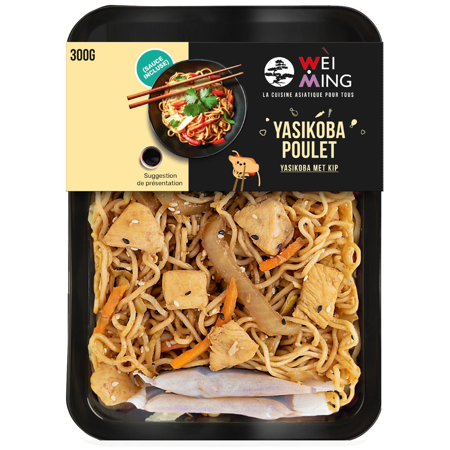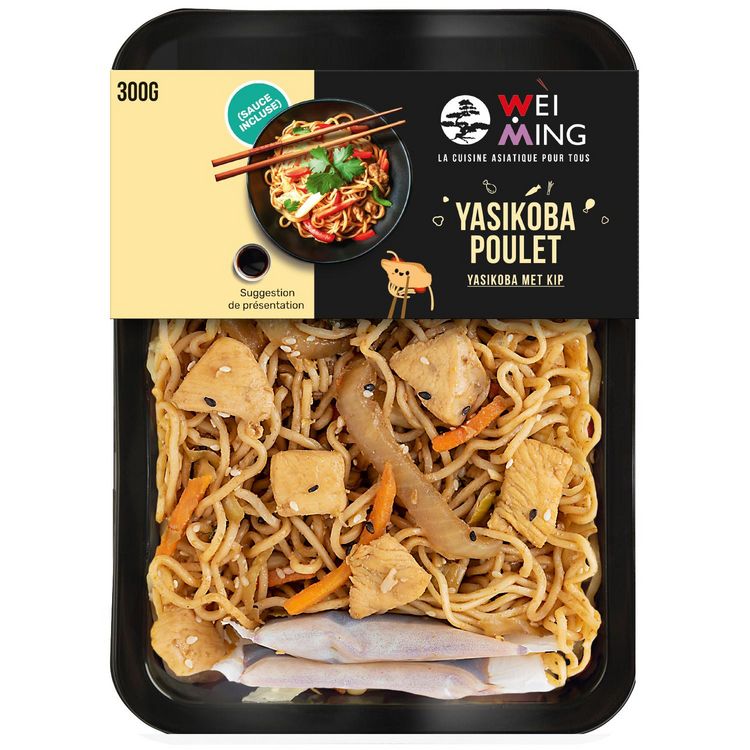 Ingrédients : Nouilles de BLE (36%), viande de poulet (13%), chou (13%), chou blanc (7%), poireau (7%), huile de colza, carotte (4%), oignons (4%), acidulants (lactate de potassium et acétates de sodium), SESAME (1%), sauce SOJA [eau, SOJA, farine de BLE, sel, conservateur (sorbate de potassium), colorant (caramel naturel)] sucre, sel, ail.