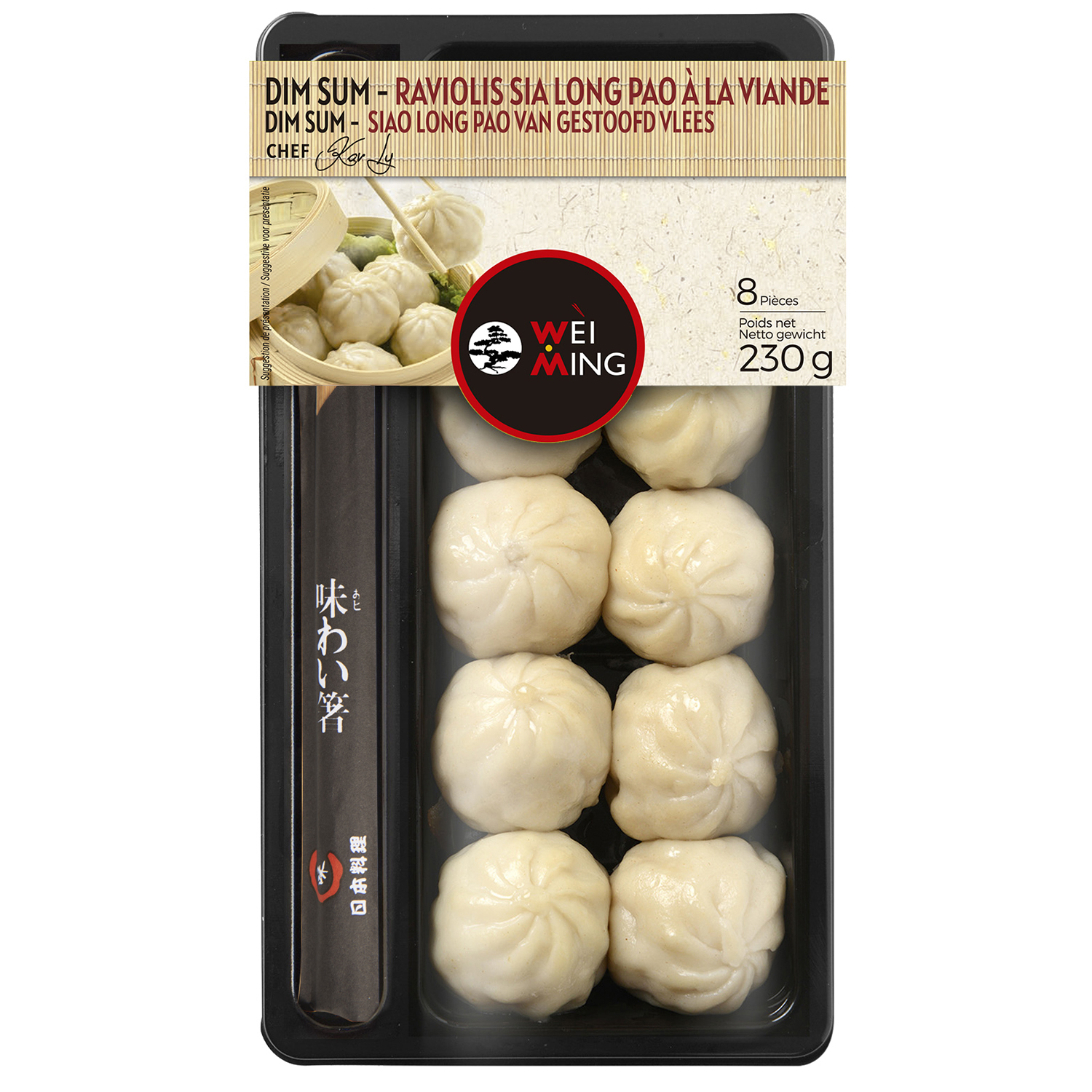 Ingrédients : Ingrédients : SIAO LONG PAO (214g): Farce (55%): chou, viande de porc (37%), poireau, protéine de soja, fécule de pomme de terre, huiles (huile de graines de sésame et huile de soja), acidulants (lactate de potassium et acétates de sodium), arôme naturel, sel, sucre, poivre noir moulu, gingembre, sauce soja (eau, soja, farine de blé, sel, conservateurs (sorbate de potassium), colorant (caramel naturel)), . Pâte (45%): farine de blé, eau, gluten de blé, sel.