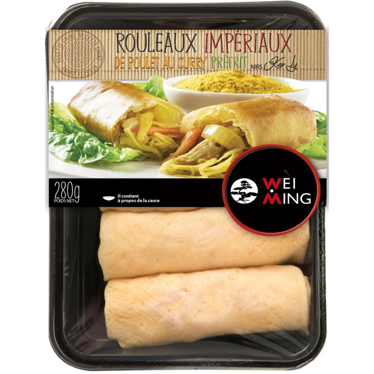 Ingrédients : Rouleaux (274g): Farce (54%): Chou (60%), oignon (15%), carotte (12%), viande de poulet (7%), huile de tournesol, sel, acidifiants (lactose de potassium et acétate de sodium), sucre, curry (1%) (curcuma, sel, coriandre, cumin, cayenne, gingembre, cannelle, fenouil, cardamome et ail) et ail. Pâte (46%): (eau, farine de blé, sel et huile de tournesol)