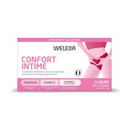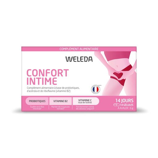 Le complément alimentaire Weleda Confort intime contribue à maintenir une bonne santé intime grâce à sa formule à base de probiotiques, de vitamine B2 (riboflavine) et de vitamine C. Les probiotiques contribuent à l'équilibre de la flore intestinale. La vitamine B2 contribue au maintien de muqueuses normales, y compris l'appareil reproducteur féminin. La vitamine C, issue d'acérola biologique, contribue au fonctionnement normal du système immunitaire et au fonctionnement normal des vaisseaux sanguins grâce à la formation normale du collagène. Programme de 14 jours, avec une gélule à prendre par jour, avec un grand verre d'eau, au minimum 30 minutes avant un repas.