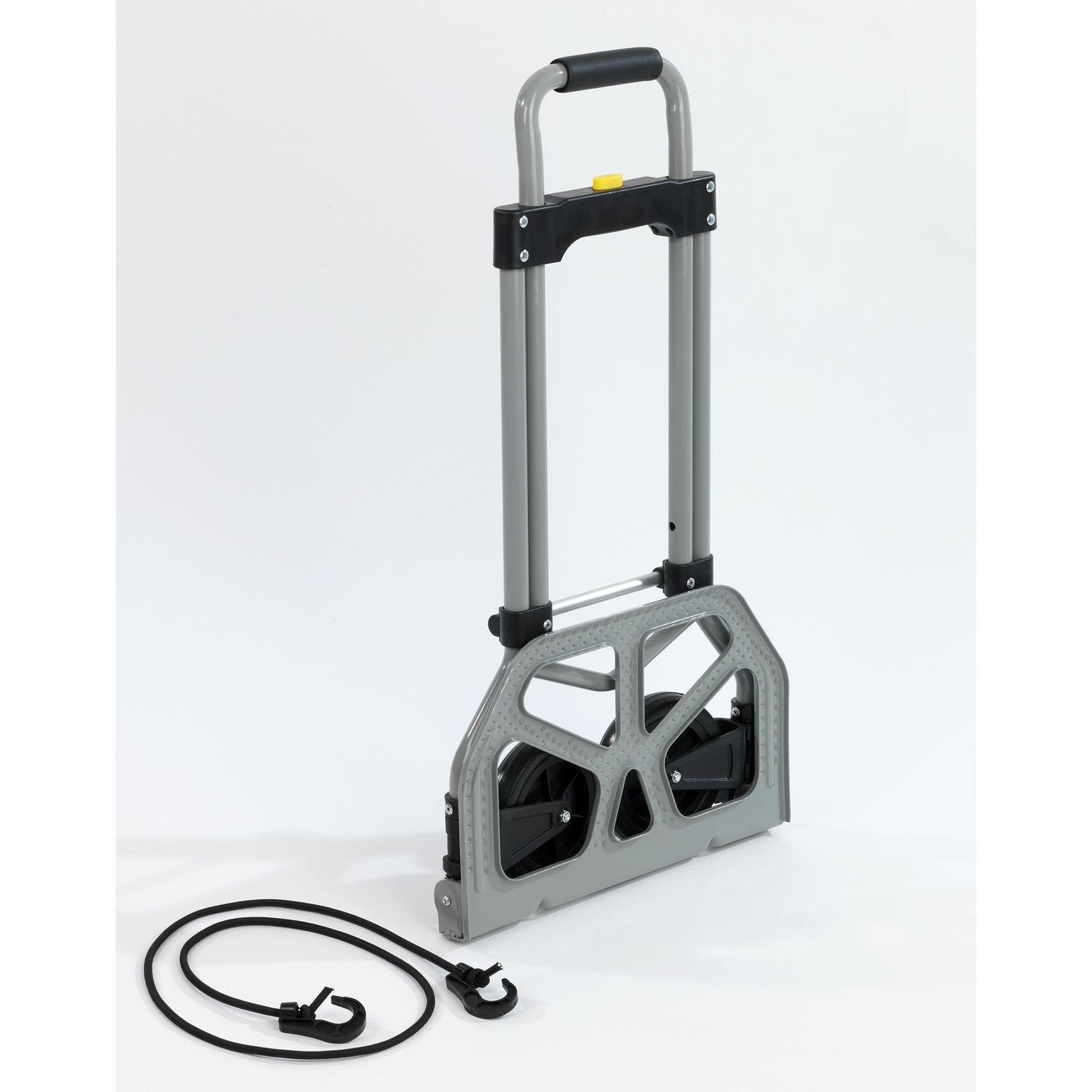 Transportez facilement vos objets les plus lourds grâce à ce chariot pliant.FICHE TECHNIQUE- Armature en acier.- Facile à manipuler, pliable et facile à ranger.- Inclus un tendeur élastique de 80 cm afin de sécuriser vos chargements.- Equipé d'une poignée télescopique permettant un usage facile.CARA