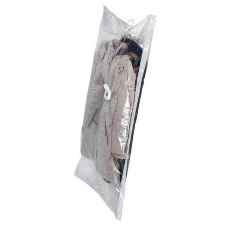Votre espace disponible est trop juste ? Dans ce cas, expulsez l'air de votre penderie. Avec le système de housse vêtements à vide, le problème de place est vite résolu. Placer tout simplement les vêtements sur des cintres puis dans la housse vêtements, fermer cette dernière et, avec un aspirateur, en extraire l'air à travers la valve express. Ensuite, il ne reste plus qu'à visser le crochet fourni et à suspendre la housse vêtements dans l'armoire. Voilà comment créer jusqu'à 75% d'espace supplémentaire avec la facilité d'un jeu d'enfants. La housse vêtements de tailles XL aux dimensions 70 x 145 cm offre des possibilités de rangement idéales pour les vêtements saisonniers relativement longs, tels les manteaux ou les robes. Elle réduit à un minimum le volume des vêtements d'été ou d'hiver. Les vêtements sont rangés sans plis. Et ils sont à l'abri de la poussière et des mites. L'aperçu sur le contenu des housses est garanti à tout moment grâce à la transparence du système de housses, sans qu'il soit nécessaire de les ouvrir. Les vêtements reprennent leur volume initial dès qu'ils sont sortis du système de rangement.