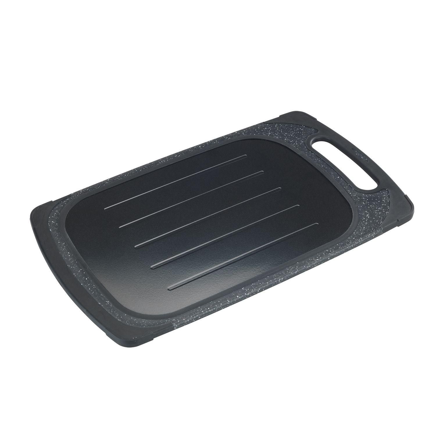 Notre planche à découper est réversible avec une face innovante de décongélation rapide. Sa plaque d‘aluminium thermo conductrice intégrée accélère le processus de décongélation des aliments surgelés ce qui vous permettra de gagner du temps lors de la décongélation de vos aliments. Les rainures intégrées ainsi que le bord en silicone gardent l'eau de dégivrage et le jus de viande sur le plateau afin que le plan de travail reste propre. La face antidérapante de la planche à découper qui est en matière synthétique est résistante, inodore et neutre au goût, et grâce aux coins en silicone cette planche garantit un découpage sûr.