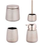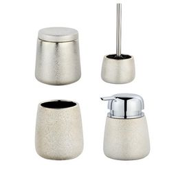 Créez une ambiance glamour dans votre salle de bain avec ce set d'accessoires à l'effet pailleté.FICHE TECHNIQUE- Set en polyrésine céramique à la surface scintillante structurée.- Lot de quatre accessoires comprenant une brosse WC à tête remplaçable, un distributeur de savon rechargeable, un pot de