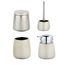 - Lot de quatre accessoires comprenant une brosse WC à tête remplaçable, un distributeur de savon rechargeable, un pot de rangement et un gobelet à brosses à dents.