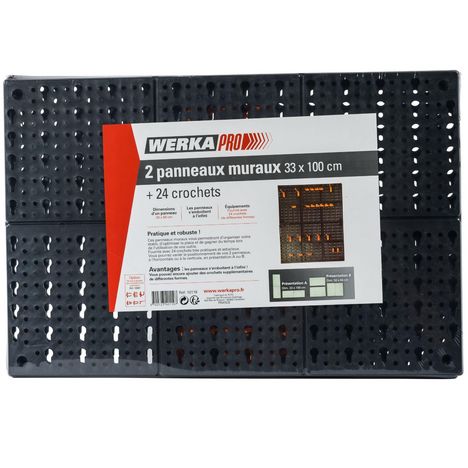 Description détaillée du produit: - 2 panneaux muraux - panneau à fixer - 2 montages possibles (montage bords à bords) - idéal pour ranger les outils dans un garage - plusieurs types de crochets pour suspendre les outils - dimensions 1 panneau: 33 x 50 cm - dimensions montage 1: 33 x 100 cm - dime