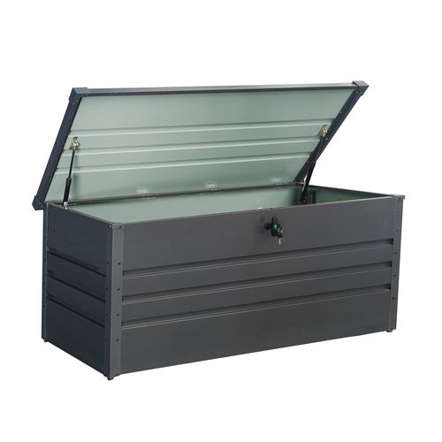 Description détaillée du coffre de rangement de jardin en métal WERKA PRO (600 litres) Univers du jardin Produit: Coffre de rangement Marque: WERKA PRO Contenance: 600 litresDimensions: Longueur: 165 cmLargeur: 70 cmHauteur: 62cm Matière: Acier peint Coloris: Gris anthracite Épaisseur structure: 0