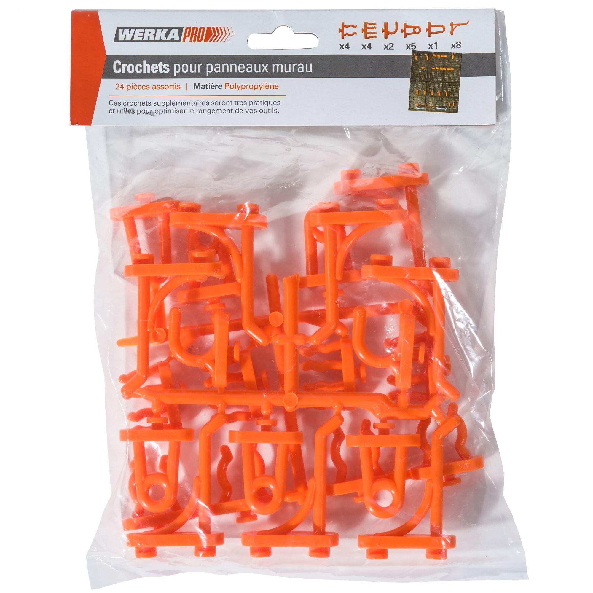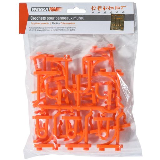 Description détaillée du produit: - produit: lot de crochets de suspension pour panneaux muraux - marque: WERKA PRO - univers: bricolage et quincaillerie - utilisation: rangement des outils - couleur: orange - composition du lot: 24 crochets de suspension - caractéristique: s'adaptent sur les panne
