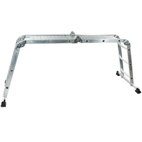 Produit: Échelle en aluminium Caractéristiques: Échelle transformable en 7 différentes positions Poids: 16,3kg Echelle aux normes EN 131 Échelle livrée avec ses deux plateaux (pour utilisation en mode échafaudage) Échelle 12 barreaux Charge maxi: 150 kg Garantie 1 an Marque: WERKA PRO Dimensions: