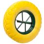Produit: Roue increvable pour brouette Dimensions: 15'' Diamètre: 385 mm Largeur: 95 mm Diamètre de l'axe: 20 mm Longueur de l'axe: 242 mm Jante en métal Coloris de la jante: Vert Couleur du pneu: Jaune Marque: WERKA PRO