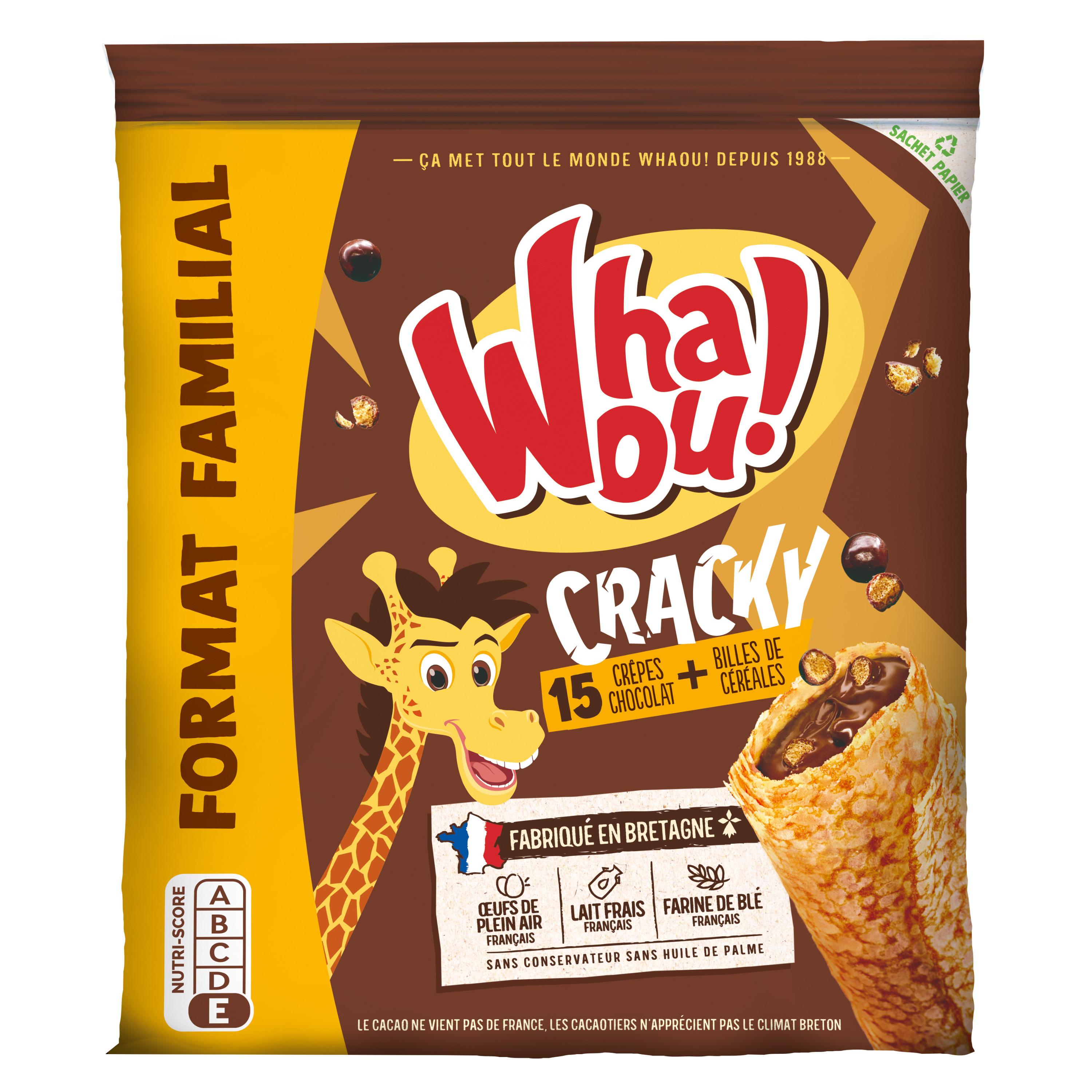 UNE CREPE AU BON GOÛT DE CHOCOLAT ET AUX BILLETTES DE CEREALES CROUSTILLANTES ELABOREE SANS HUILE DE PALME ET SANS CONSERVATEUR, PREPAREE AVEC DU BON LAIT FRAIS LIVRE TOUS LES JOURS ET DES ŒUFS DE PLEIN AIR FACILE À TRANSPORTER DANS SON SACHET FRAÎCHEUR, LA CREPE WHAOU! ACCOMPAGNE VOS ENFANTS DANS LEURS NOMBREUSES ACTIVITES.