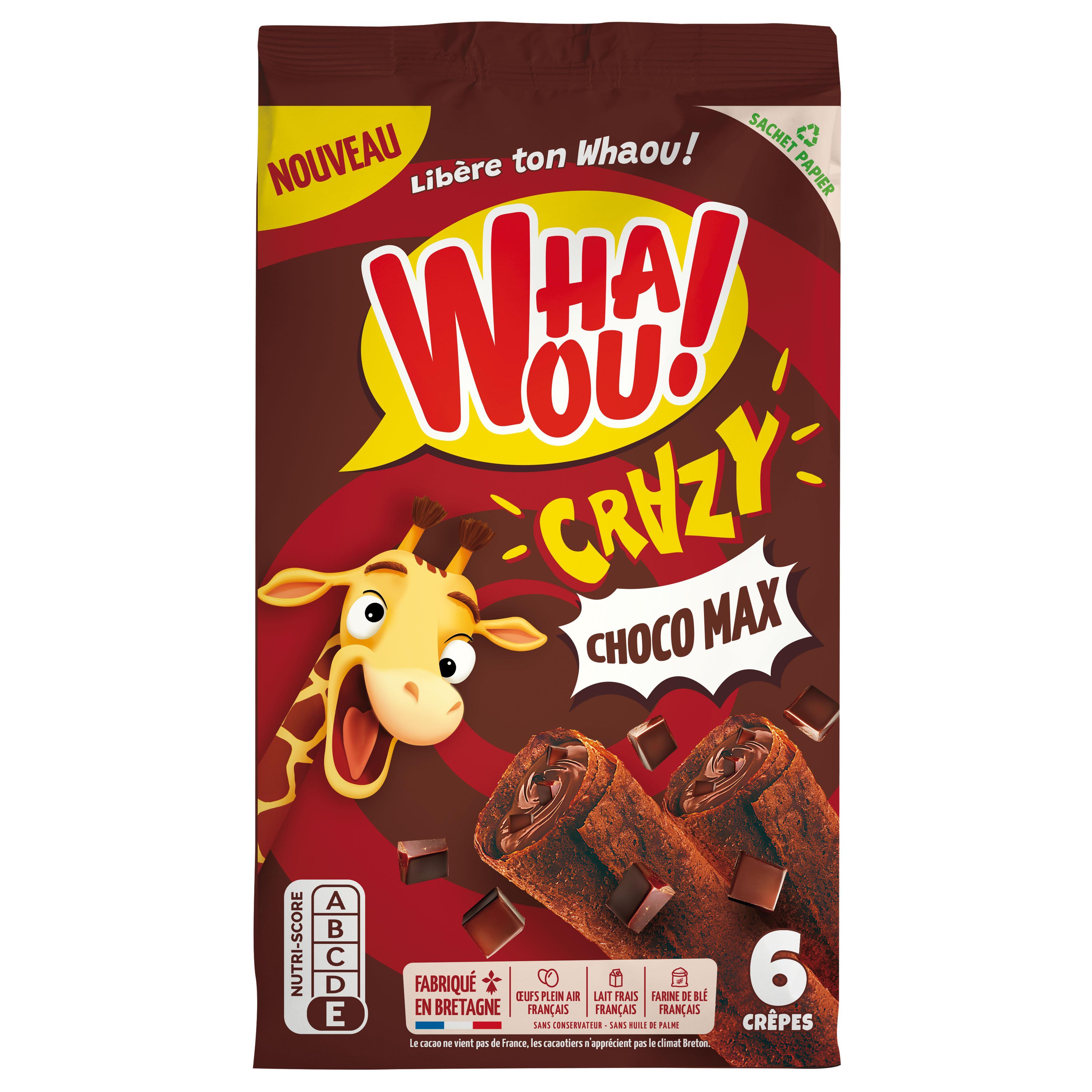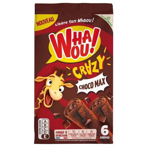 UNE DÉLICIEUSE CRÊPE AU BON GOÛT DE CHOCOLAT ET PÉPITES DE CHOCOLAT ÉLABORÉE SANS HUILE DE PALME ET SANS CONSERVATEUR, PRÉPARÉE AVEC DU BON LAIT FRAIS LIVRE TOUS LES JOURS ET DES ŒUFS DE PLEIN AIR. FACILE À TRANSPORTER DANS SON SACHET FRAÎCHEUR, LA CRÊPE WHAOU! ACCOMPAGNE VOS ENFANTS DANS LEURS NOMBREUSES ACTIVITÉS.
