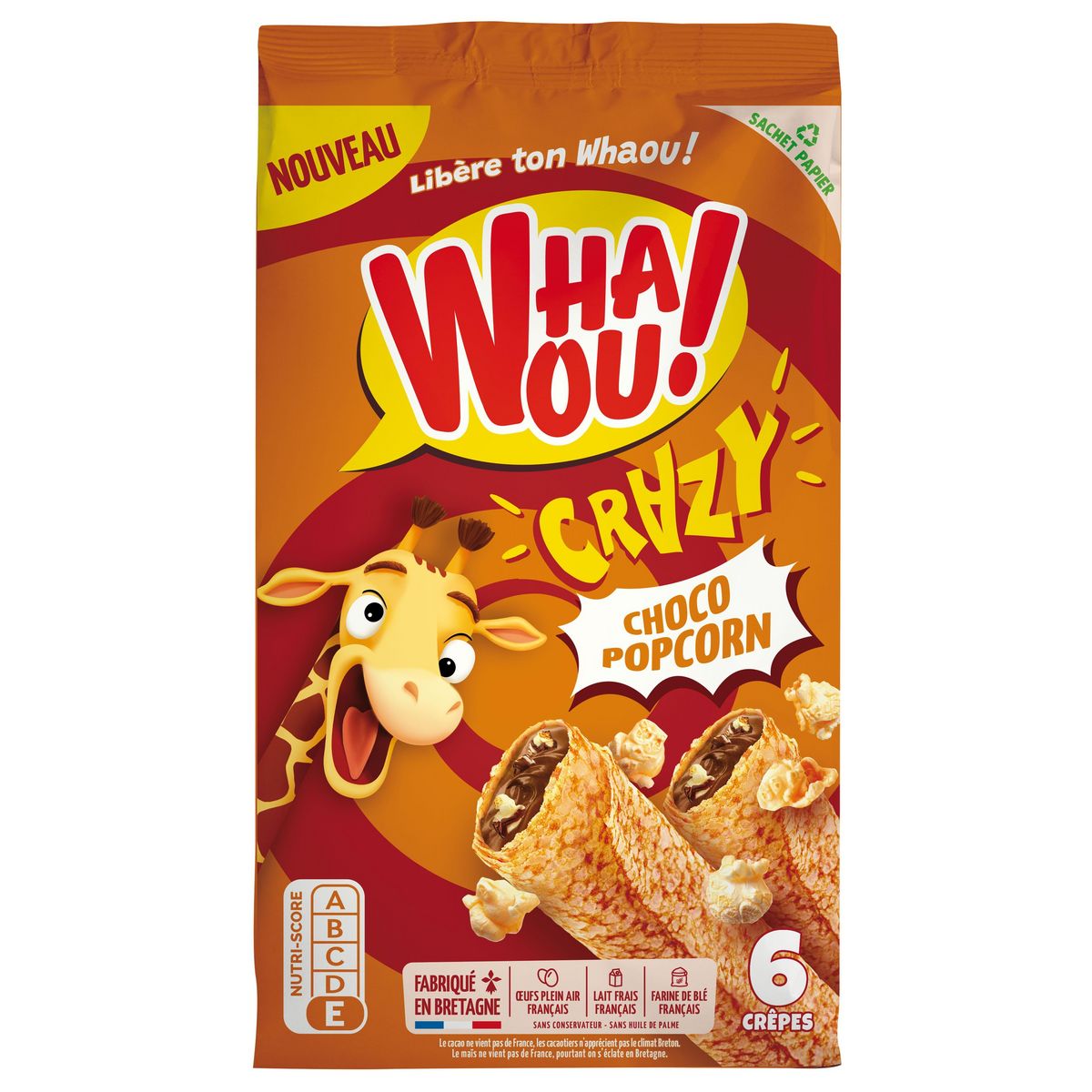 UNE DÉLICIEUSE CRÊPE AU BON GOÛT DE CHOCOLAT ET PÉPITES DE CHOCOLAT ÉLABORÉE SANS HUILE DE PALME ET SANS CONSERVATEUR, PRÉPARÉE AVEC DU BON LAIT FRAIS LIVRE TOUS LES JOURS ET DES ŒUFS DE PLEIN AIR. FACILE À TRANSPORTER DANS SON SACHET FRAÎCHEUR, LA CRÊPE WHAOU! ACCOMPAGNE VOS ENFANTS DANS LEURS NOMBREUSES ACTIVITÉS.