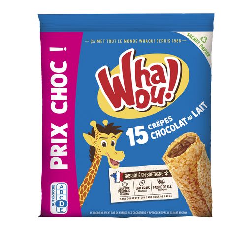 Une délicieuse crêpe au bon goût de chocolat au lait élaborée sans huile de palme et sans conservateur, préparée avec du bon lait frais livré tous les jours et des œufs extra frais. Facile à transporter dans son sachet fraîcheur, la crêpe Whaou! accompagne vos enfants dans leurs nombreuses activités.