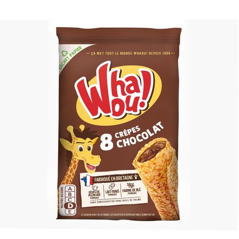 UNE DÉLICIEUSE CRÊPE AU BON GOÛT DE CHOCOLAT ÉLABORÉE SANS HUILE DE PALME ET SANS CONSERVATEUR, PRÉPARÉE AVEC DU BON LAIT FRAIS LIVRE TOUS LES JOURS ET DES ŒUFS DE PLEIN AIR. FACILE À TRANSPORTER DANS SON SACHET FRAÎCHEUR, LA CRÊPE WHAOU! ACCOMPAGNE VOS ENFANTS DANS LEURS NOMBREUSES ACTIVITÉS.