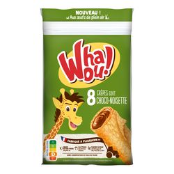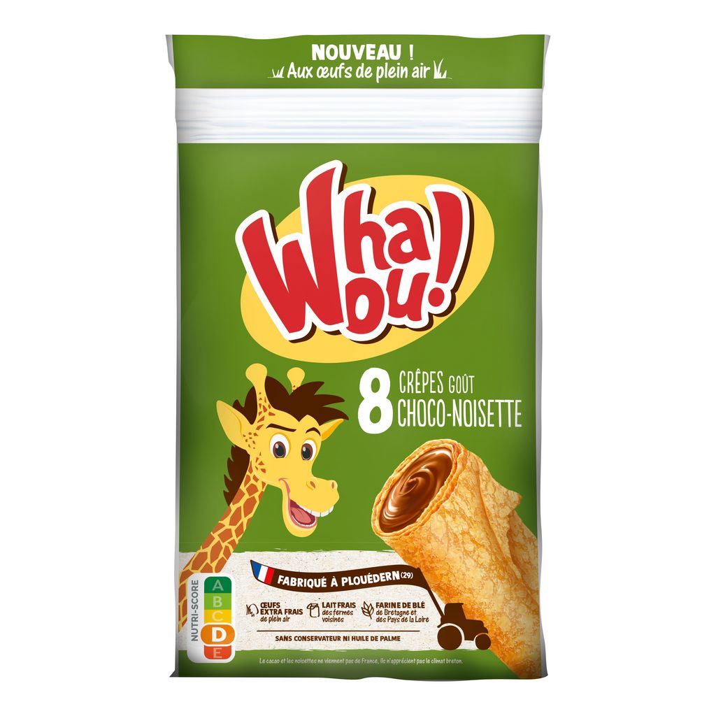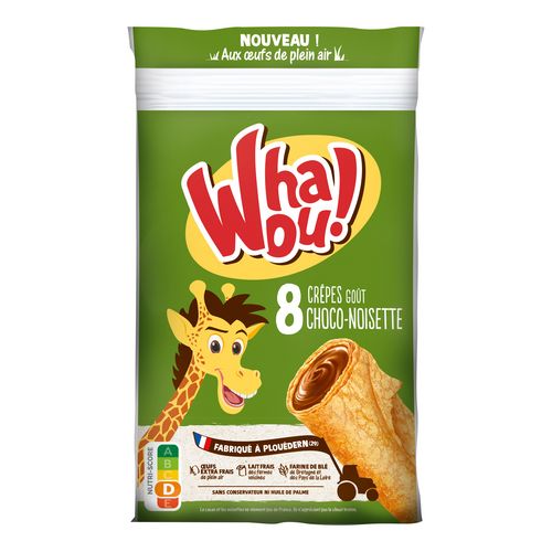 UNE DÉLICIEUSE CRÊPE AU BON GOÛT DE CHOCO-NOISETTE ÉLABORÉE SANS HUILE DE PALME ET SANS CONSERVATEUR, PRÉPARÉE AVEC DU BON LAIT FRAIS LIVRE TOUS LES JOURS ET DES ŒUFS EXTRA FRAIS FACILE À TRANSPORTER DANS SON SACHET FRAÎCHEUR, LA CRÊPE WHAOU! ACCOMPAGNE VOS ENFANTS DANS LEURS NOMBREUSES ACTIVITÉS.