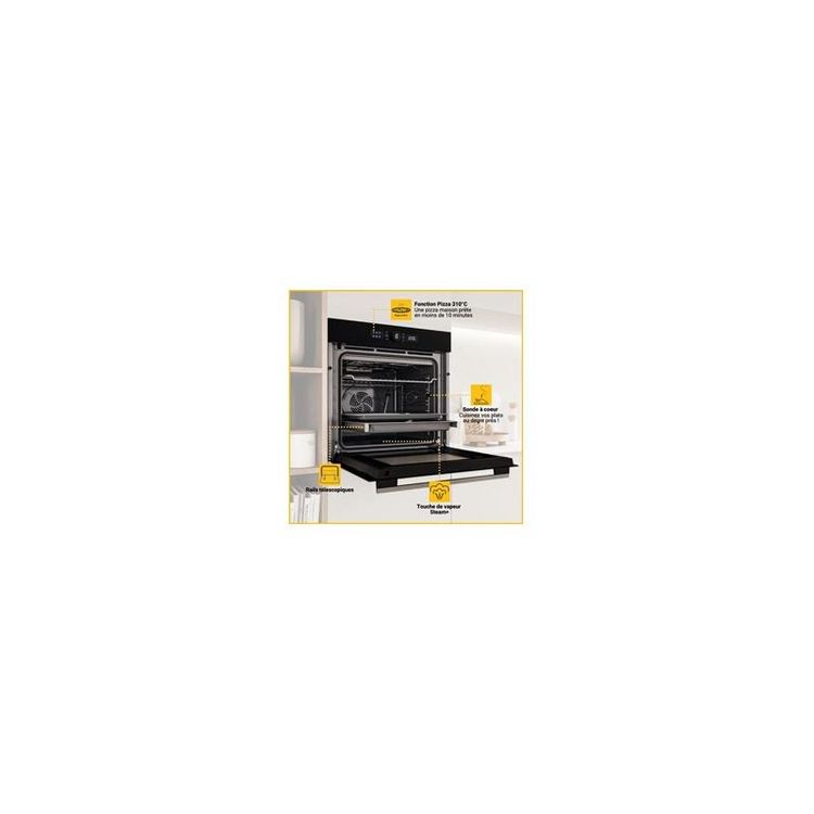 Accessoires fournis : 1 sonde à coeur,1 grille, 1 lèchefrite, 1 lèchefrite profond, Rails télescopiques.