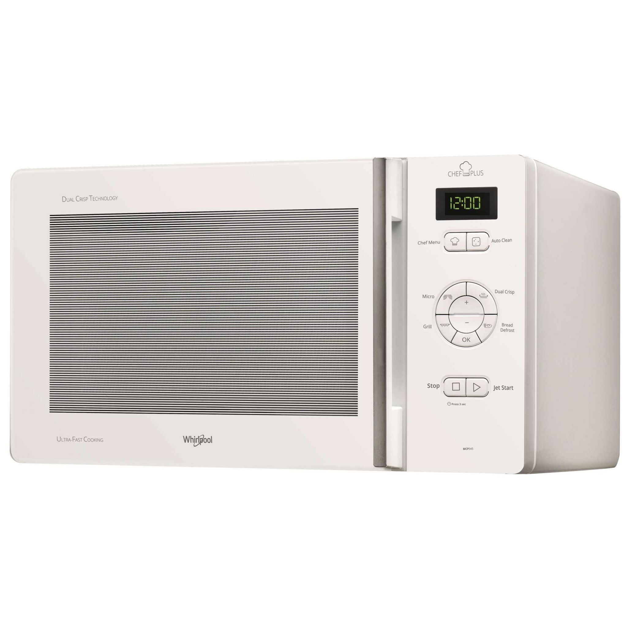 Whirlpool MCP345WH Micro-ondes grill Whirlpool MCP345WH d'une capacité de 25 litres avec plateau tournant de 28 cm.Fonction CRISPBrevet exclusif Whirlpool, le crisp vous permet :1. une cuisson comme au four en 3 fois moins de temps2. des résultats alliant croustillant et moelleux3. une polyvalence: il est idéal pour vos apéritifs, entrées et desserts!Chef MenuAvec Chef Menu, découvrez jusqu'à 22 recettes automatiques pour cuisiner tous vos plats!Auto CleanAvec ce programme de nettoyage facilité, passez un coup d'éponge et votre micro-ondes sera nettoyé!