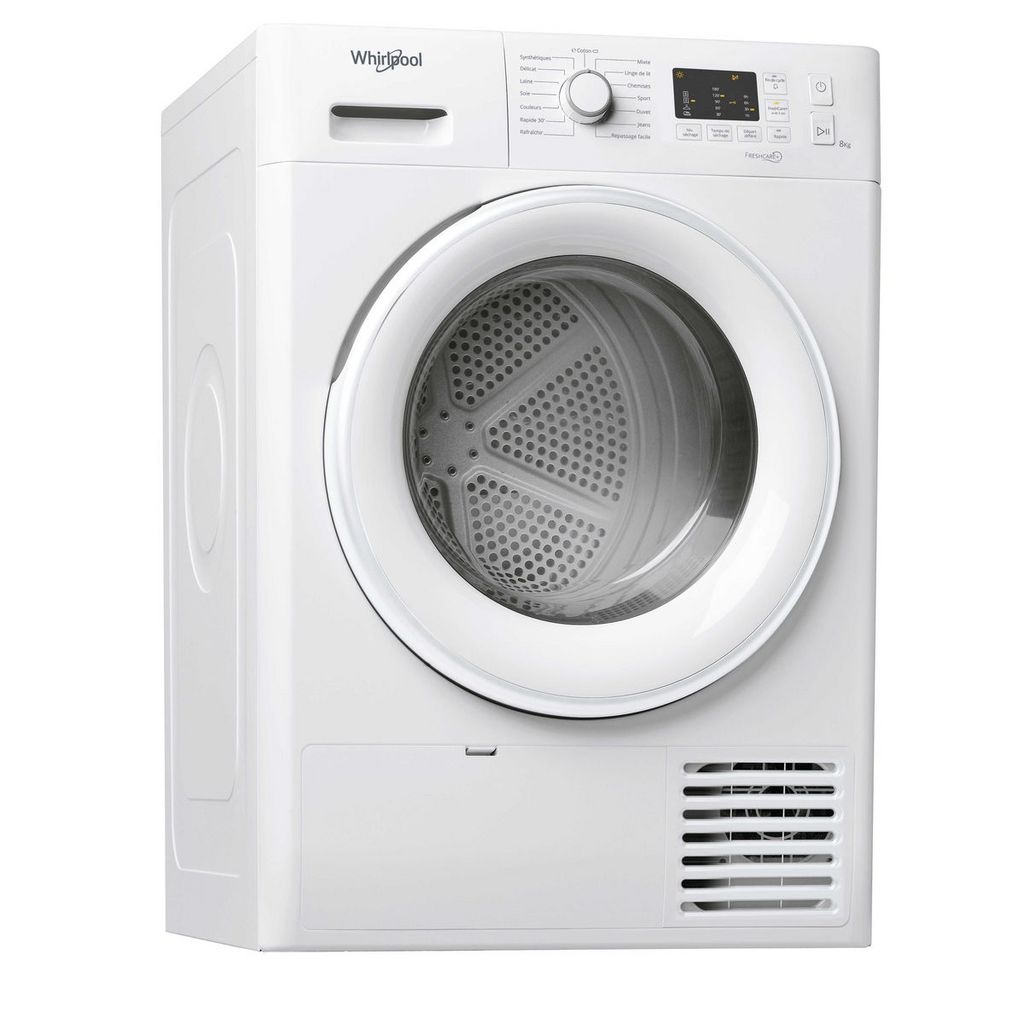 Whirlpool vous propose ce sèche linge d'une capacité de 8 Kg, il fonctionne avec un système de séchage par condensation et propose pas moins de 15 programmes avec entre autres les classiques coton et rapide mais aussi certains plus spécifiques comme le programme laine ou encore jean.
