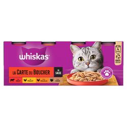 Les boîtes pour chat Whiskas® La Carte du Boucher en Sauce sont disponibles en format 4x400g.