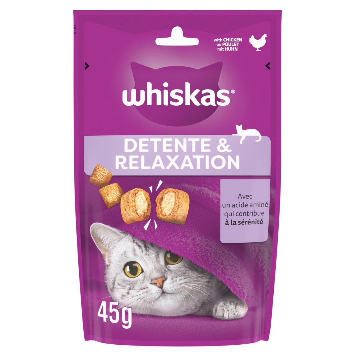 WHISKAS Relax Unwind Détente Relaxation au poulet Aliment complémentaire pour chats adultes sont disponibles au format sachet referbale 45g pour une meilleure conservation.