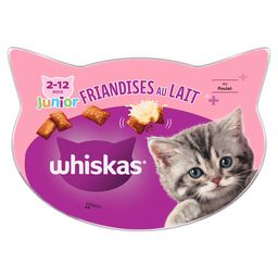 Aliment complémentaire pour chatons (2 à 12 mois) - Au Lait. Whiskas® Junior Friandises au lait est riche en lait pour favoriser des os solides. Ces friandises spécialement adaptées pour chaton sevré à partir de 8 semaines sont croquantes avec un coeur fondant, sans arôme artificiel. Disponible dans une boîte refermable pour une meilleure conservation. Elaborées pas nos nutritionnistes et nos vétérinaires du centre de recherche WALTHAM®, les friandises délicieusement croquantes et au cœur fondant Whiskas®Junior Friandises au Lait sont un snack idéal pour faire plaisir et prendre soin de votre chaton.