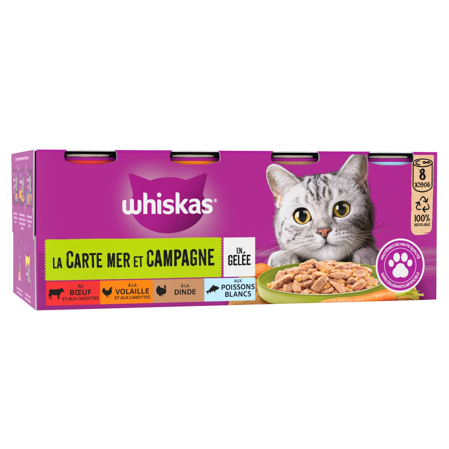 Les boîtes pour chat Whiskas® La Carte Mer et Campagne en Gelée sont disponibles en format 8x390g.