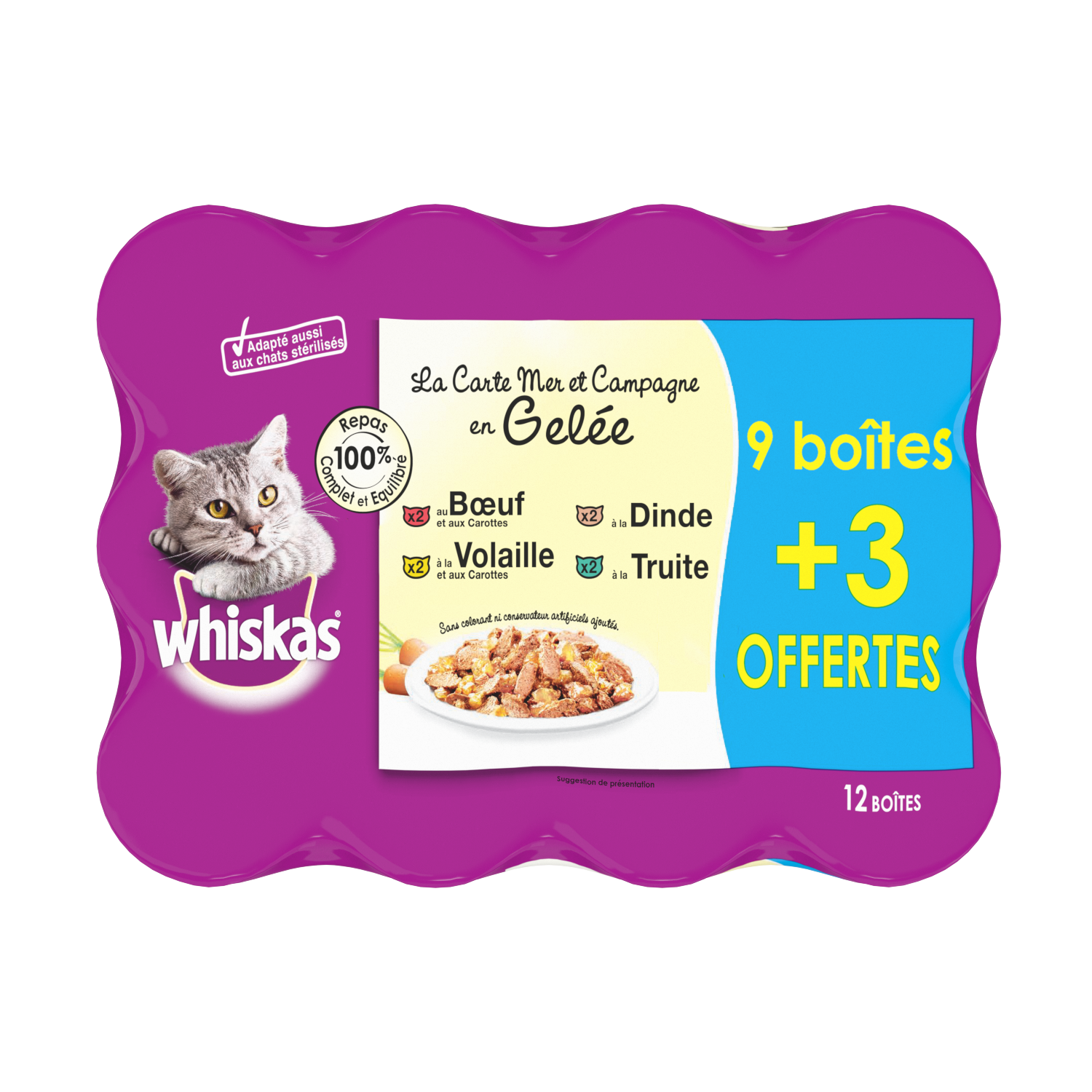 WHISKAS Boîtes en gelée 4 variétés pour chat 12x390g - 9+3 offertes
