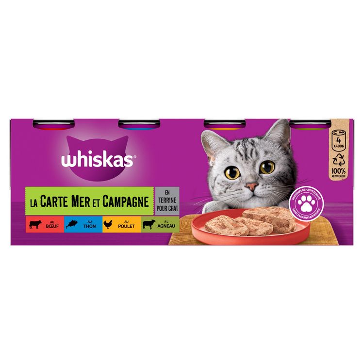 Les boîtes pour chat Whiskas® La Carte Mer et Campagne en Terrine pour chat sont disponibles en format 4x400g.