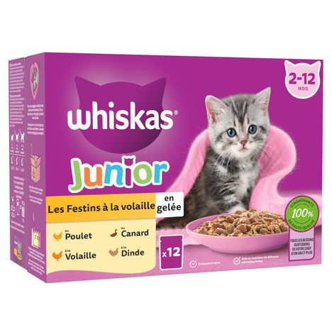 Aliment humide complet pour chatons de 2 à 12 mois - Sachets fraîcheur Whiskas®JUNIOR Les Festins à la Volaille en gelée 4 variétés (au Poulet / au Canard / à la Volaille/ à la Dinde). Avec des bouchées plus petites conçues pour les plus petites gueules faciles à manger et à digérer. Des recettes spécialement préparées pour chatons avec des ingrédients de haute qualité, une délicate texture et un goût irrésistible pour un plaisir garanti! Offrez à votre chat les saveurs qu'il préfère et toutes les bonnes choses dont il a besoin pour varier les plaisirs tout en l'aidant à grandir heureux et en bonne santé. Un repas complet et équilibré qui apporte à votre chaton les nutriments essentiels dont il a besoin pourune croissance saine: des vitamines essentielles et de la taurine pour renforcer ses défenses naturelles pendant qu'ils explorent leur nouveau monde, du calcium pour aider à la formation d'os et de dents solides, des protéines de haute qualité pour faciliter la digestion. Nourriture pour chat mise au point avec nos nutritionnistes et nos vétérinaires du centre de recherche WALTHAM® - Principale référence mondiale pour la nutrition et le bien-être des animaux de compagnie. Pâtée pour chat disponible dans un sachet fraîcheur pratique d'utilisation. Un format idéal pour offrir à votre félin adoré une nourriture toujours fraîchement servie. Plus de gamelles propres et moins de restes !