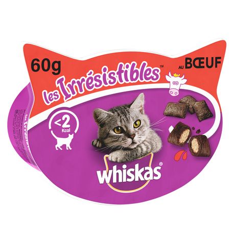 Aliment complémentaire pour chats adultes - au Bœuf. Les friandises Whiskas® Les Irrésistibles® sont particulièrement appréciées par les chats grâce à leur texture croquante à l'extérieur et tendre à l'intérieur, à moins de 2 kcal par friandise. Pratique d'utilisation grâce à sa boîte refermable pour une meilleure conservation.