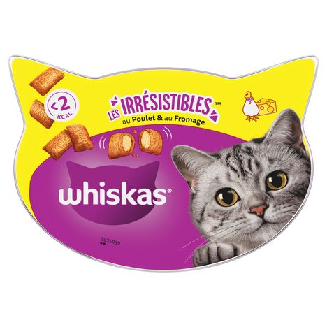 Aliment complémentaire pour chats adultes - au Poulet et au Fromage. Les friandises Whiskas® Les Irrésistibles® sont particulièrement appréciées par les chats grâce à leur texture croquante à l'extérieur et tendre à l'intérieur, à moins de 2 kcal par friandise. Pratique d'utilisation grâce à sa boîte refermable pour une meilleure conservation.