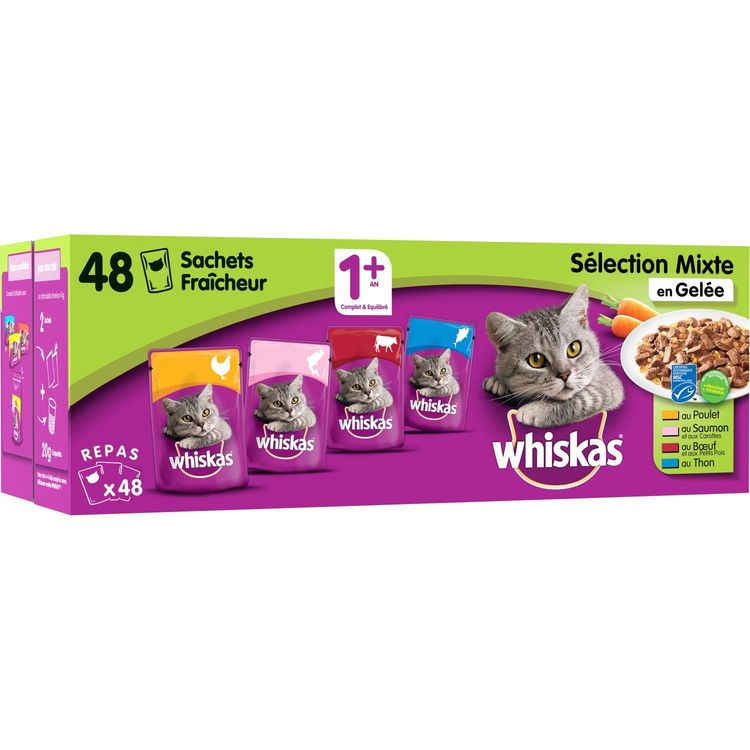Aliment humide complet pour chats adultes à partir de 1 an - 4 variétés sélection mixte en gelée (Au Saumon et aux Carottes / Au Thon / Au Poulet /Au Boeuf et aux Petits Pois). Pâtée adaptée aussi aux chats stérilisés. Avec les sachets fraîcheur Whiskas®, nous vous aidons à nourrir votre chat à chaque étape de sa vie, avec des repas qu'il aimera instinctivement. Notre gamme de sachets fraîcheur WHISKAS® 1+ offre une variété de repas complets dans une savoureuse gelée, parfaitement équilibrés pour aider votre chat à rester heureux et plein de vitalité. Nos délicieux repas, élaborés avec une combinaison d'ingrédients naturels* sélectionnés + vitamines + minéraux, contribuent à apporter à votre chat tout ce dont il a nutritionnellement besoin pour une vie saine : Avec du zinc et de l'huile de tournesol, une source naturelle d'acides gras oméga-6, pour aider à maintenir une peau et un pelage sains; Teneur équilibrée en minéraux pour contribuer au bon fonctionnement urinaire. Sans colorant artificiel ajouté. Sans conservateur ajouté. Nos poissons sont issus de la pêche durable MSC selon le référentiel MSC. www.msc.org/fr MSC-C-52780. Lorsqu'il s'agit d'alimentation, nous pensons que votre chat sait choisir naturellement ce qu'il aime. C'est pourquoi chez Whiskas®, nous mettons toute notre passion et notre savoir-faire dans la sélection de nos ingrédients et l'élaboration de recettes variées. Ainsi, chaque repas Whiskas® offre à votre chat les saveurs qu'il préfère et toutes les bonnes choses dont il a besoin. Nourriture pour chat mise au point avec les nutritionnistes et les vétérinaires du centre de recherche WALTHAM® - Principale référence mondiale pour la nutrition et le bien-être des animaux de compagnie. WHISKAS Sachets fraîcheur en gelée sélection mixte 48x100g