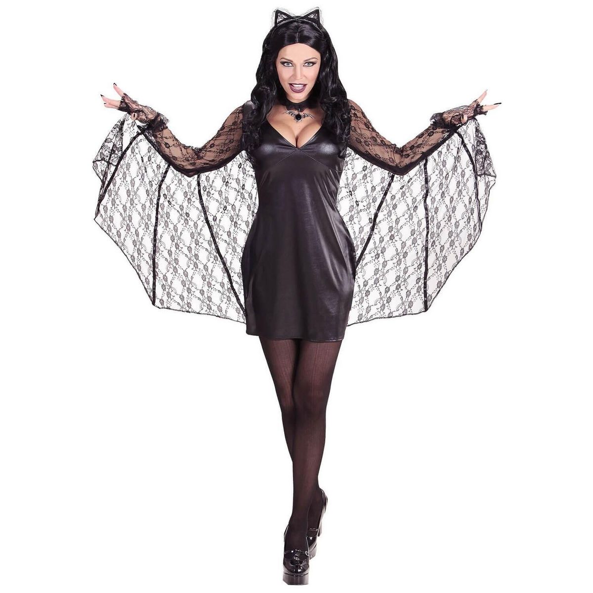 L - 40/42 - Contenu : 1 robe avec des ailes, 1 serre-tête avec des oreilles. Ce déguisement se compose d'une robe courte noire effet simili cuir. La robe possède des manches longues en dentelle. Les ailes sont en dentelle et sont reliées de la manche à la robe. En bougeant les bras vous ferez égalem