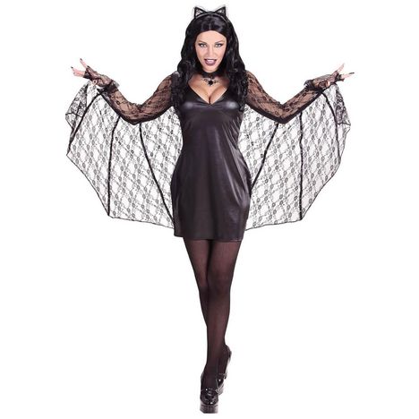 S - 36/38 - Contenu : 1 robe avec des ailes, 1 serre-tête avec des oreilles. Ce déguisement se compose d'une robe courte noire effet simili cuir. La robe possède des manches longues en dentelle. Les ailes sont en dentelle et sont reliées de la manche à la robe. En bougeant les bras vous ferez égalem