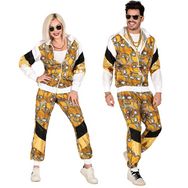 M - Contenu : 1 veste, 1 pantalon. Ce déguisement se compose d'une veste et d'un pantalon assorti. Le pantalon est resserré au niveau des chevilles. Il possède une bande noir et une bande doré sur chaque jambe. Il y a un motif avec des cranes de squelette dorés. La veste possède les mêmes motifs que le pantalon. Les manches sont blanches et resserrées au niveau des poignets. La veste peut se fermer à l'aide d'une fermeture éclair. Age minimum : la naissance