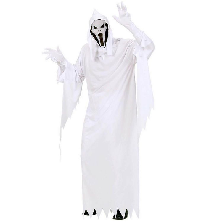 S - Contenu : 1 tunique, 1 masque avec capuche.Ce déguisement se compose d'une longue tunique blanche à manches longues. Il y a des effets de déchirures sur le bas de la tunique et le bas des manches. Le déguisement vient avec un masque avec capuche qui s'enfile comme une cagoule. Le masque est noir avec un visage de fantôme blanc ouvrant la bouche comme s'il hurlait. Age minimum : la naissance