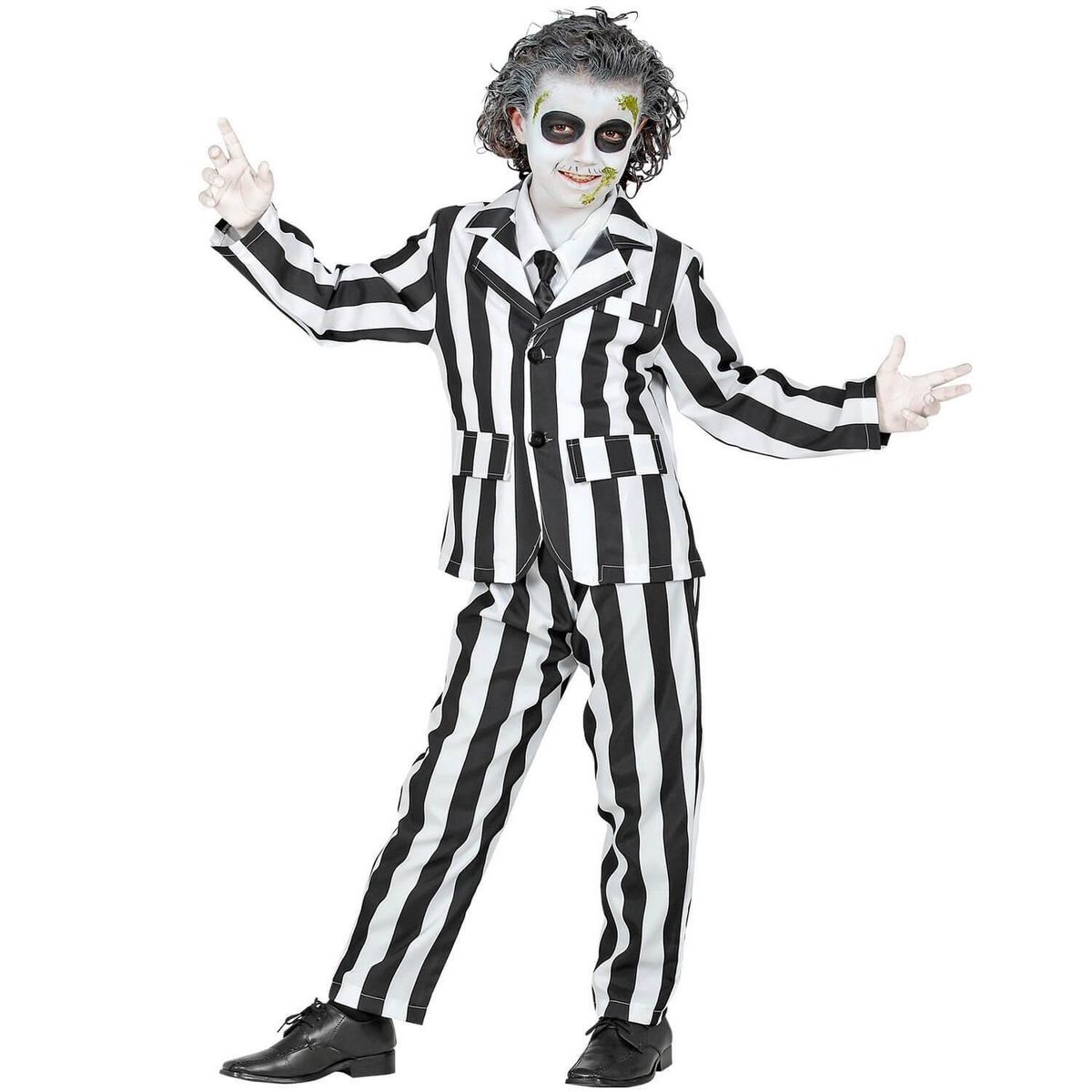 11/13 ans (145 à 158 cm) - Contenu : 1 veste, 1 pantalon, 1 cravate.Ce déguisement se compose d'un pantalon et d'une veste assortie. La veste et le pantalon sont à rayures blanches et noires La veste se ferme à l'aide de deux boutons noires. La veste possède également 3 fausses poches. Le déguisement vient avec une cravate noire pour terminer le look. Age minimum : la naissance