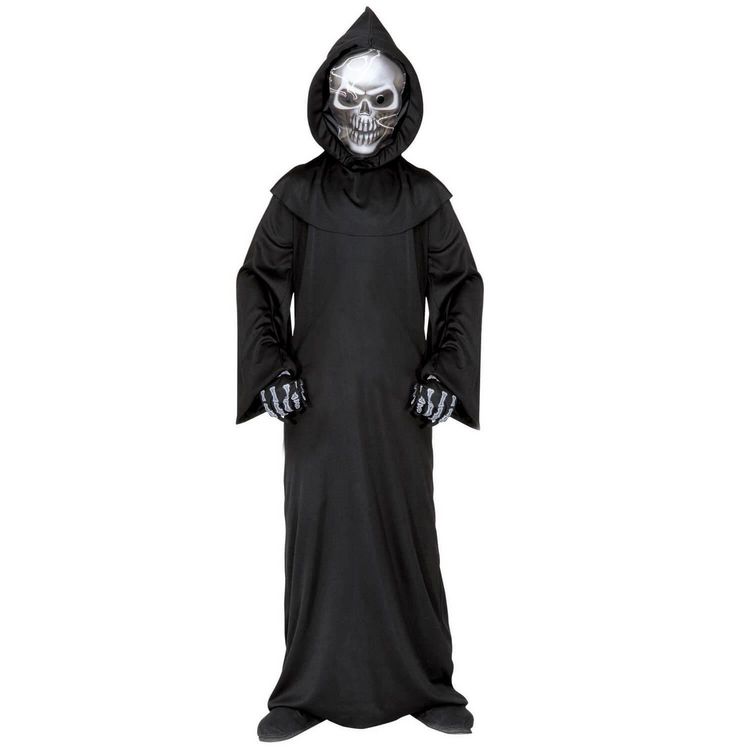 11/13 ans (145 à 158 cm) - Contenu : 1 tunique, 1 masque avec capuche, 1 paire de gants.Ce déguisement se compose d'une grande tunique noire. Elle possède des manches longues et va jusqu'aux pieds. Il y a également un col berthe noir par-dessus la tunique. Le déguisement vient avec une paire de gants noirs avec un dessin de squelette reprenant les os de la main. Une capuche incluse avec un masque s'enfile sur la tête comme une cagoule. Le masque possède des trous pour les yeux et a un dessin de crâne de squelette avec un effet façon holographique. La capuche est pointue. Age minimum : la naissance