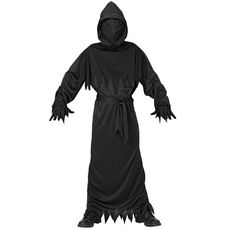 14/16 ans (156 à 174 cm) - Contenu : 1 tunique à capuche et masque, 1 ceinture.Ce déguisement se compose d'une tunique noire à manches longues. Elle possède une capuche pointue avec un masque intégré. Le masque est en tissu noir et recouvre l'ensemble du visage. Le bas des manches et de la robe sont découpées en pointe pour donner un effet déchiré. On retrouve également cet effet déchiré sur la tunique. Le déguisement vient avec une ceinture qui se noue à la taille. Age minimum : la naissance