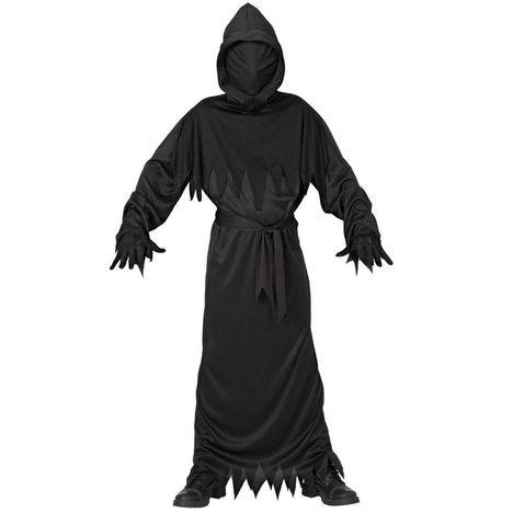 4/5 ans (104 à 110 cm) - Contenu : 1 tunique à capuche et masque, 1 ceinture.Ce déguisement se compose d'une tunique noire à manches longues. Elle possède une capuche pointue avec un masque intégré. Le masque est en tissu noir et recouvre l'ensemble du visage. Le bas des manches et de la robe sont découpées en pointe pour donner un effet déchiré. On retrouve également cet effet déchiré sur la tunique. Le déguisement vient avec une ceinture qui se noue à la taille. Age minimum : la naissance