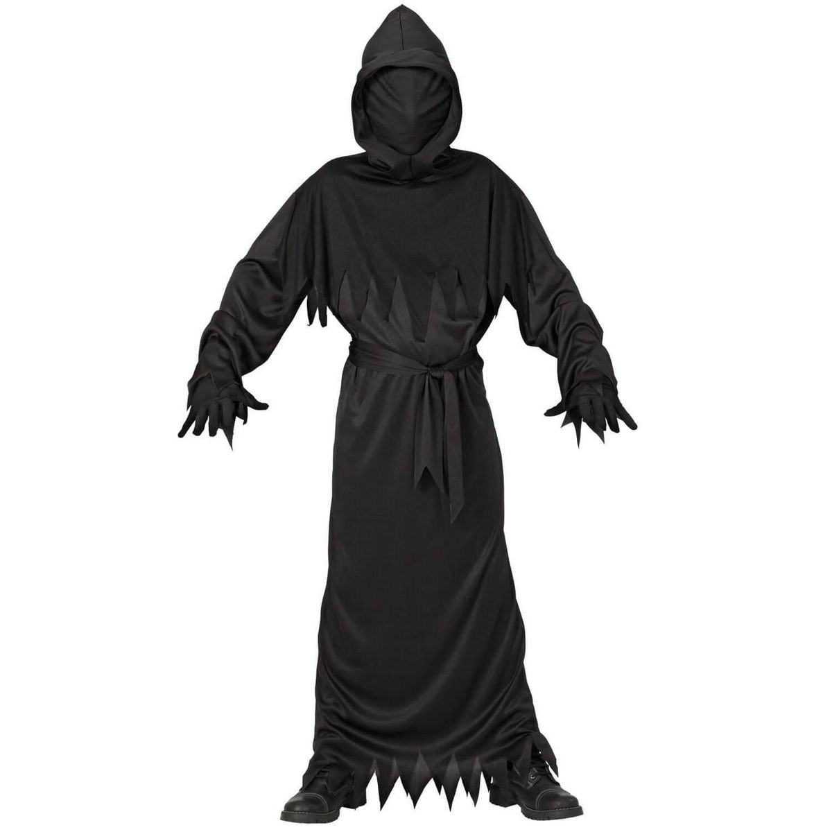 8/10 ans (128 à 140 cm) - Contenu : 1 tunique à capuche et masque, 1 ceinture.Ce déguisement se compose d'une tunique noire à manches longues. Elle possède une capuche pointue avec un masque intégré. Le masque est en tissu noir et recouvre l'ensemble du visage. Le bas des manches et de la robe sont découpées en pointe pour donner un effet déchiré. On retrouve également cet effet déchiré sur la tunique. Le déguisement vient avec une ceinture qui se noue à la taille. Age minimum : la naissance