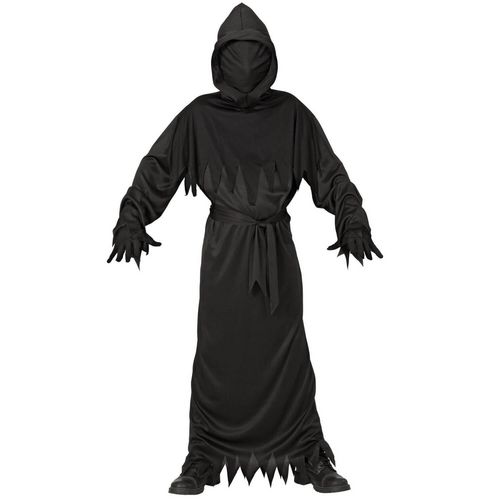 8/10 ans (128 à 140 cm) - Contenu : 1 tunique à capuche et masque, 1 ceinture.Ce déguisement se compose d'une tunique noire à manches longues. Elle possède une capuche pointue avec un masque intégré. Le masque est en tissu noir et recouvre l'ensemble du visage. Le bas des manches et de la robe sont