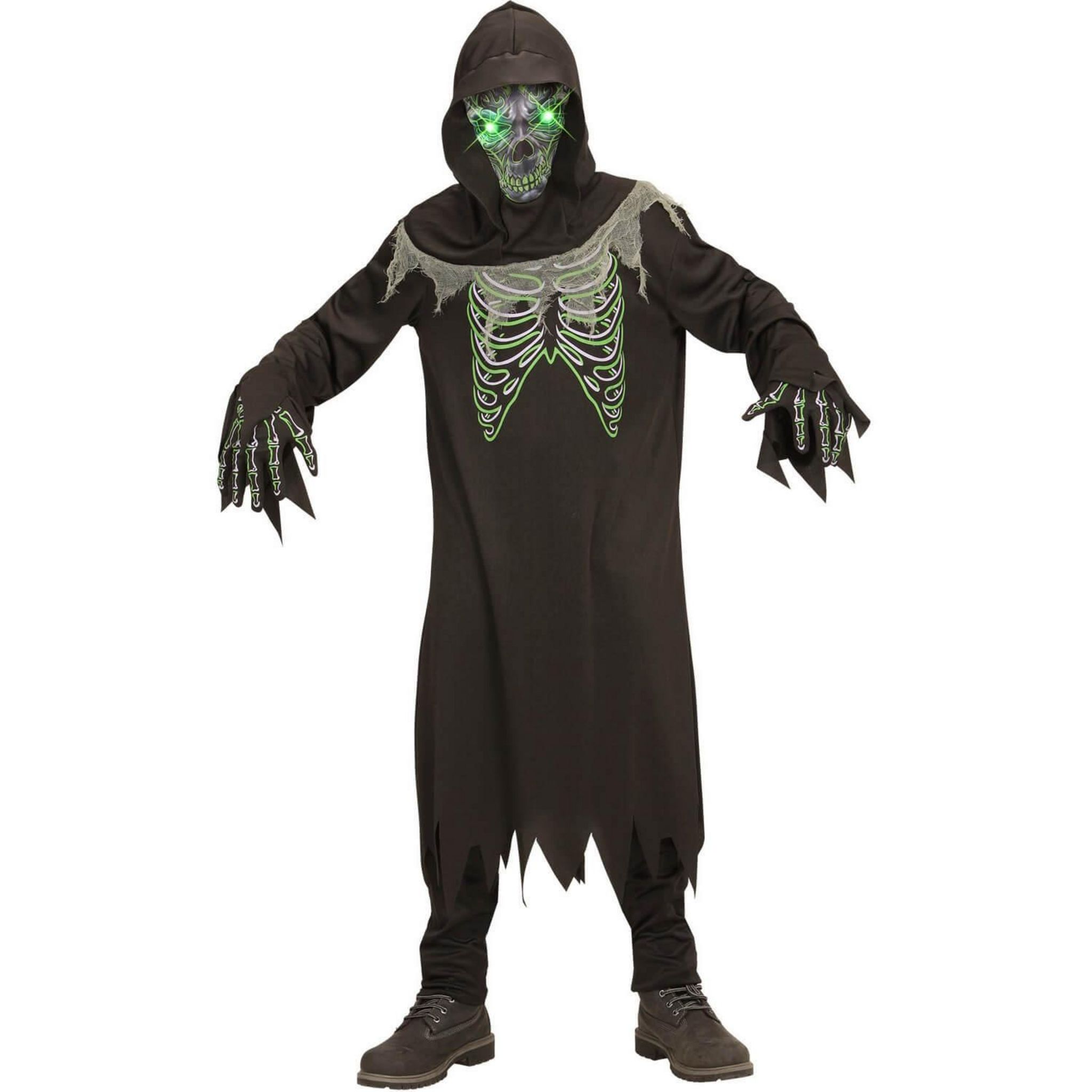 14/16 ans (156 à 174 cm) - Contenu : 1 tunique, 1 masque yeux lumineux, 1 paire de gants, 2 piles AAA.Ce déguisement se compose d'une grande tunique noire à manches longues. La tunique ne va pas jusqu'aux pieds et possède un effet déchiré sur le bas et au niveau des poignets. Il y a sur le buste un dessin d'os de cage thoracique blancs et verts. Des gants noirs avec des dessins d'os blancs et verts sont inclus avec le déguisement. Un masque qui s'enfile comme une cagoule vient également avec la tenue. Il est noir avec des détails de tissu gris déchiré. Il y a un visage de crâne de squelette gris et vert. La particularité de ce costume réside dans les yeux lumineux verts. Les yeux clignotent et fonctionnent à l'aide de 2 piles AAA incluses. Age minimum : la naissance
